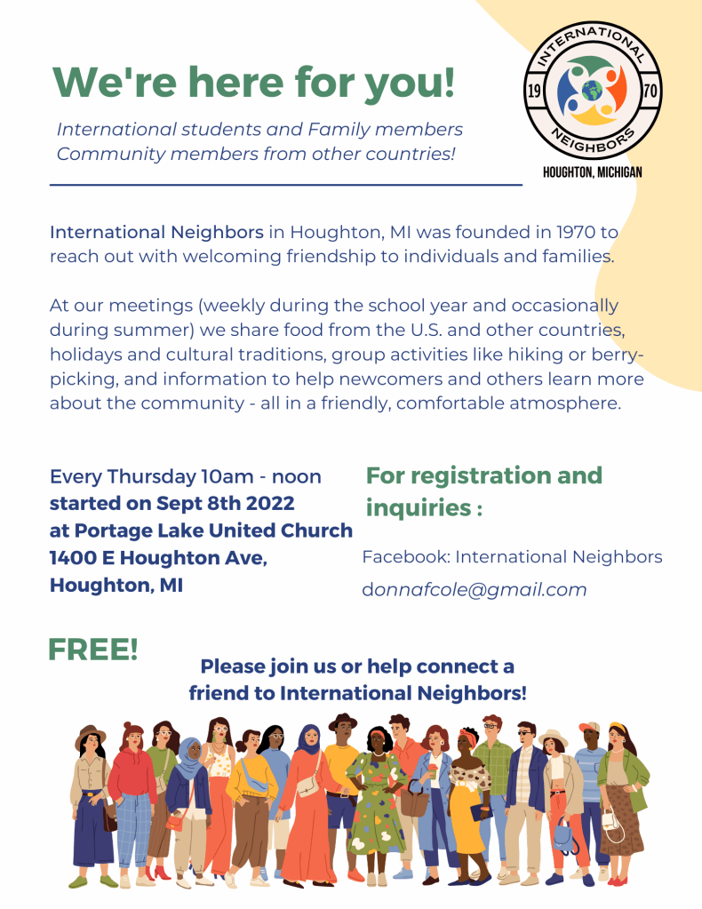 Come join International Neighbors meeting every: Thursday, from 10 – noon, at Portage Lake United Church (across the MTU Administration Building).