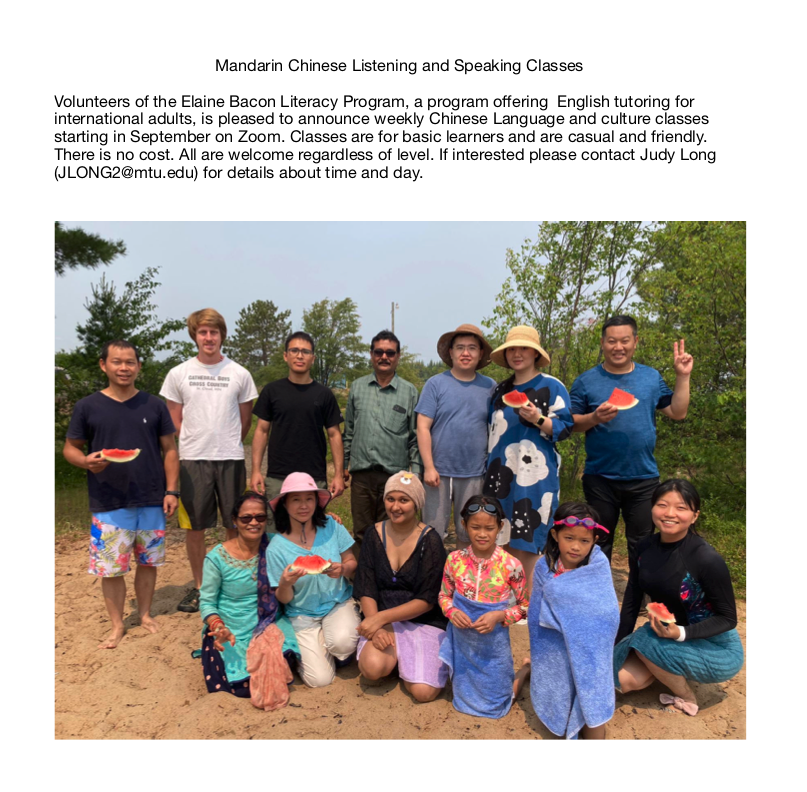 Shasha Zhang, our first Chinese language teacher, has been teaching Chinese language every Tuesday evening for a few years. Now she and her family are on their way to Sweden for a 6 month sabbatical, and we wish her a wonderful experience! We thank her also for enlisting a new teacher to keep the class going. Judy Long (jlong2@mtu.edu), a new PhD student at Michigan Tech, has agreed to become our new teacher and is ready to begin a new semester in September. Currently, there are still openings in this Zoom class. Please contact Judy for more details.