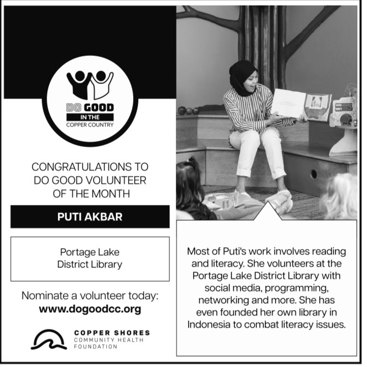 Congratulations to our own Puti Ceniza Akbar for winning October’s Do Good in the Copper Country Volunteer award in recognition of her many volunteer efforts in the Copper Country.