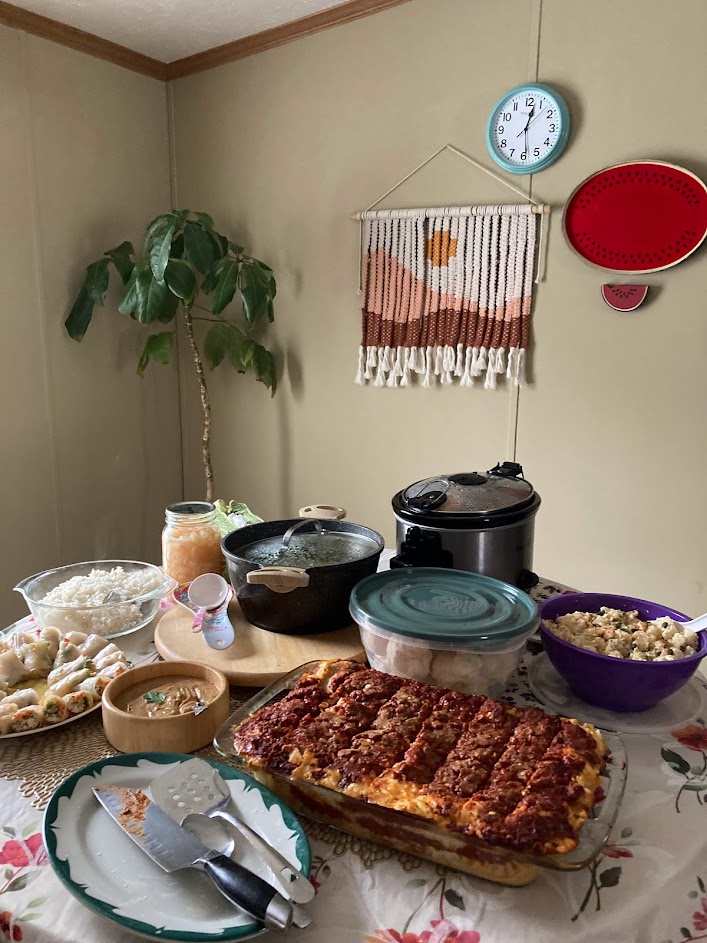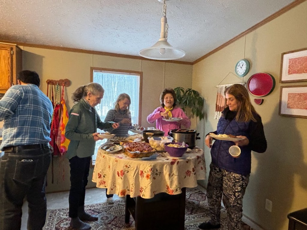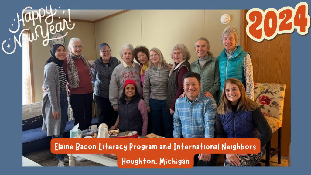 On January 4th, The Elaine Bacon Literacy Program joined International Neighbors for a potluck luncheon at Puti Akbar’s house to celebrate the New Year and share good friends and good food. Countries represented in addition to United States (Denise, Beth, Jan, Candy, Donna, Amy, and Cindy) were Brazil (Aline and mother-in-law Rita), China (Xiaolei/Victor), Japan(Miyoko), and Indonesia (Puti).