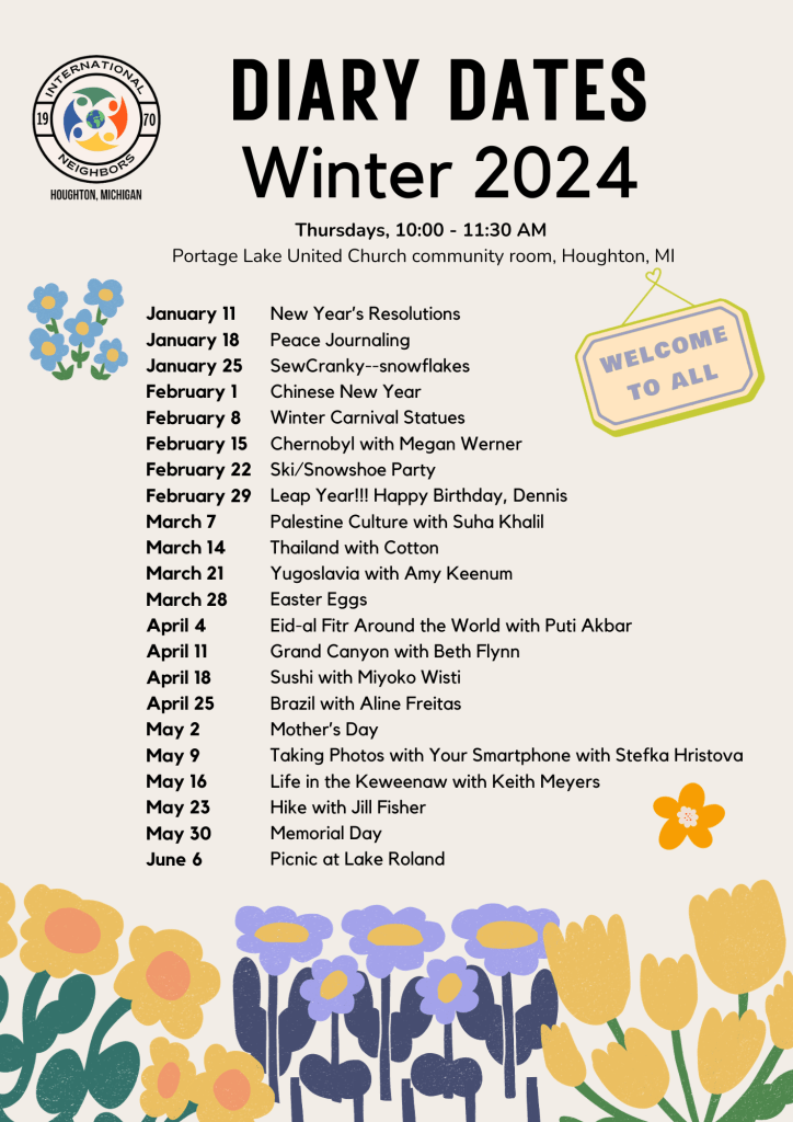 International Neighbors meets every Thursday morning during the year at 10:00 am at Portage Lake United Church near the university. All are welcome. Below is the slate of programs for the upcoming year.