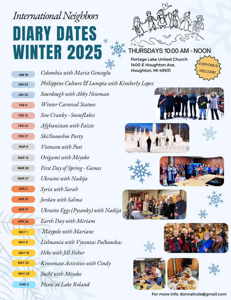 Join us every Thursday from 10:00 AM to noon at Portage Lake United Church (1400 E Houghton Ave, Houghton, MI). Here are some highlights from our Winter Diary January – June 2025: