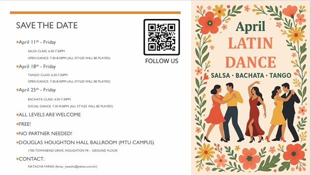 • April 25: An introduction to bachata, followed by our last social of the semester.
