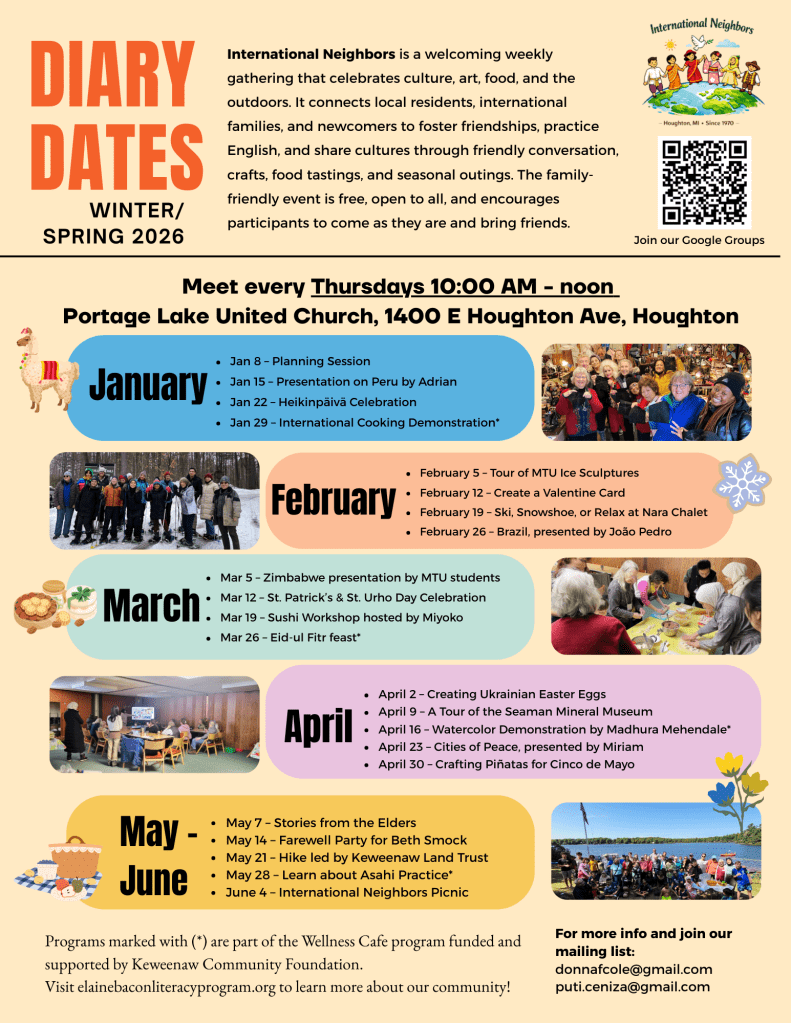 As always, International Neighbors is a welcoming community gathering that celebrates culture, art, food, and the outdoors. We bring together local residents, international families, newcomers, and longtime Yoopers to build friendships, practice English, and share cultures in a relaxed, family-friendly environment. Everyone is welcome — adults and children, friends and newcomers alike.