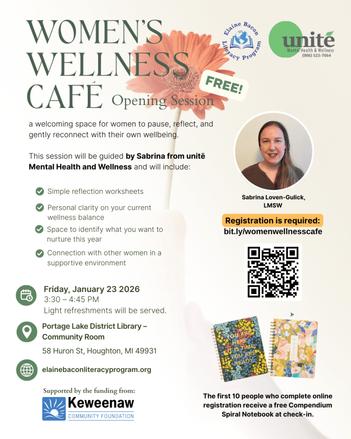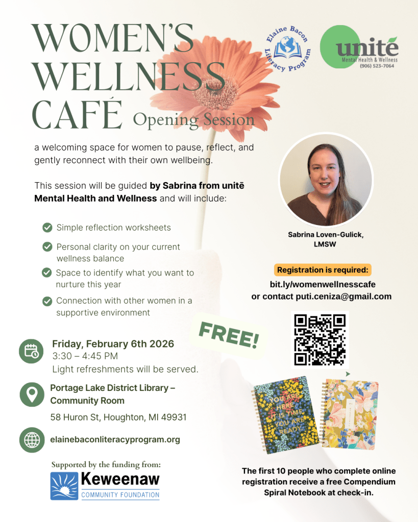 The Elaine Bacon Literacy Program, in collaboration with unitē Mental Health & Wellness, is excited to invite the community to the opening session of the Women’s Wellness Café — a gentle, welcoming gathering designed to support reflection, connection, and everyday wellbeing.