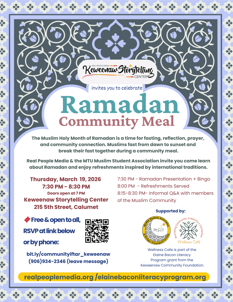 Hosted by Real People Media / Keweenaw Storytelling Center in partnership with Elaine Bacon Literacy Program.