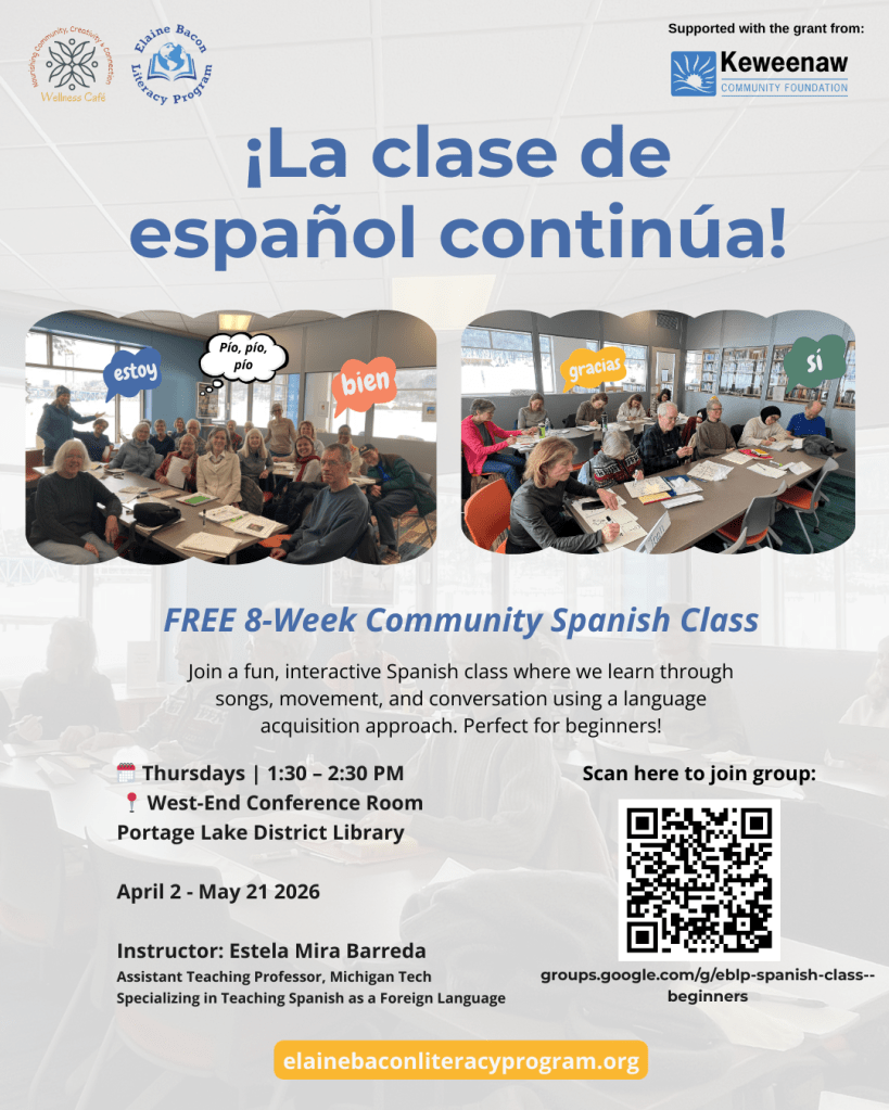This Spanish class is part of the Wellness Café initiative, supported by a grant from the Keweenaw Community Foundation, which encourages programs that nurture wellbeing, learning, and community engagement.