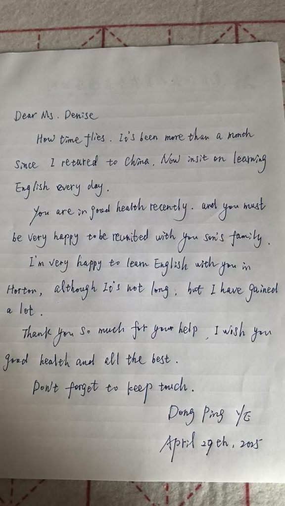 Note from Denise: Before returning to Harbin, China, Dongping spent several meaningful months in Houghton with his daughter and her family. Every Friday morning, he would visit me for English practice. These weekly meetings became a highlight of my week—always filled with dedication, curiosity, and laughter.